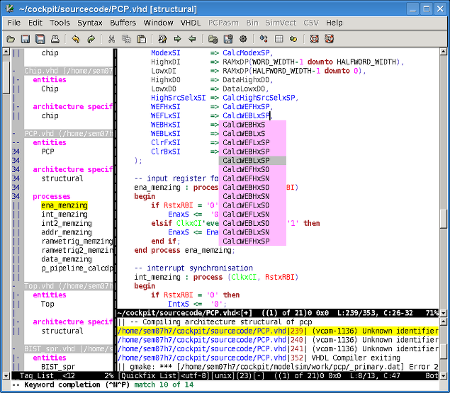 During a semester project at ETH Zurich, I created some VHDL related Vim settings. They make Vim quite efficient - during my project I was able to do most of the work from within Vim, even running test-benches and doing simulations. I hope they may be useful to others as well and will therefore show you how to set them up.
